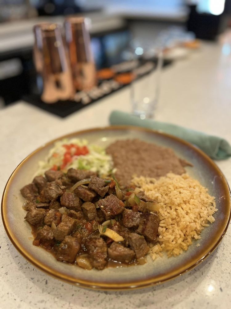 Mexican Style Beef Stew prepared with chunks of Beef and Potatoes, served with Rice and Beans.